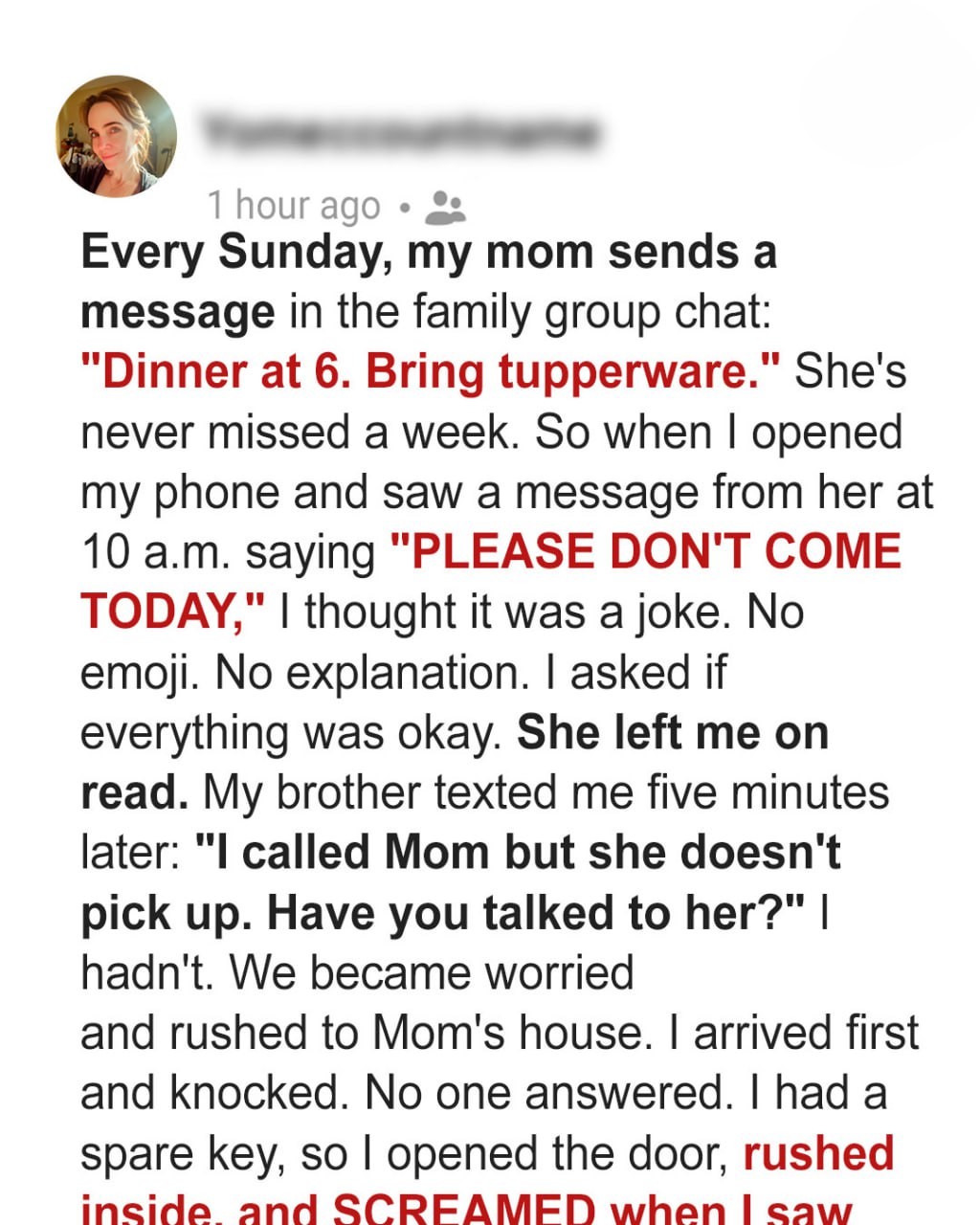 But deep down, I knew this was different. Mom had never, not once, canceled Sunday dinner.