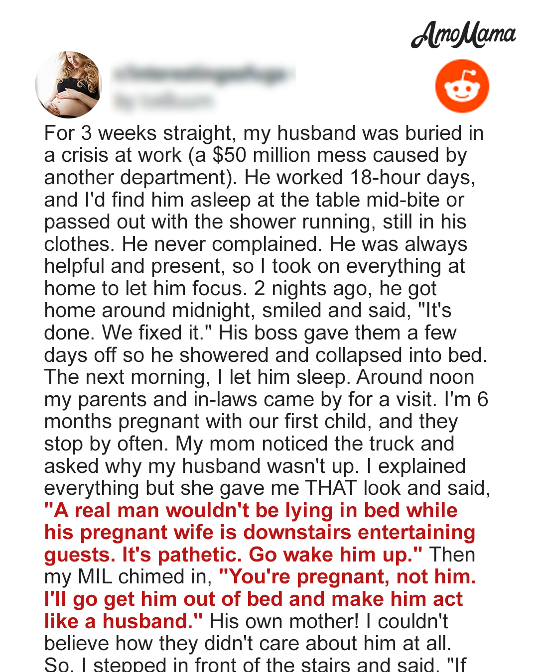 “If you think I’m going to let you march into our room and drag my husband out of bed after what he’s just been through, then you are not welcome in this house,” I said, enunciating every word. “If you can’t respect my request to leave him alone, then I need you to leave.”