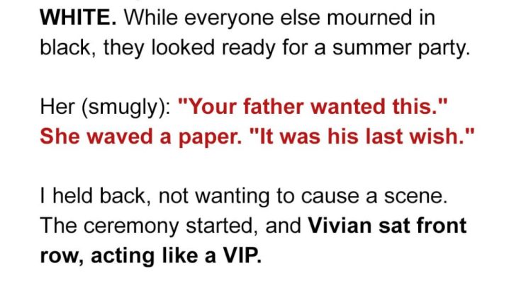 She cut me off, reaching into her designer handbag and pulling out a neatly folded envelope. “He wrote me a letter,” she said, holding it out as if it explained everything. “Told me, ‘Vivian, you and the kids are to wear white. It’s my last wish.’”