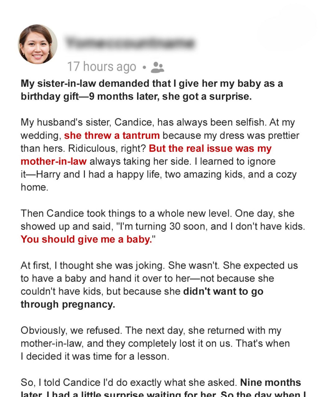 When the time came, I announced I would give birth in another city. Candice pouted but accepted my reasoning—I told her the “gift” had to remain a surprise until her birthday. After all, it was a present, right?