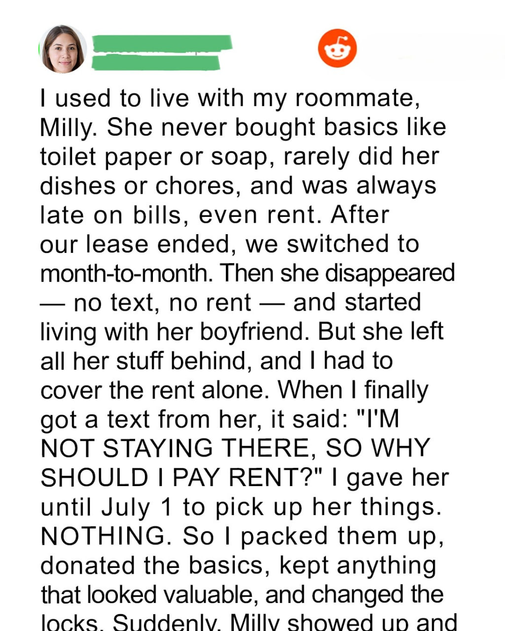 When my roommate disappeared overnight to live with her boyfriend, I thought she’d at least handle the rent situation like an adult. Two months later, she showed up pounding on my door, screaming about changed locks and missing belongings.When I first rented this place, the landlord told me there was already one person living here, and they just needed one more roommate. Her name was Milly.