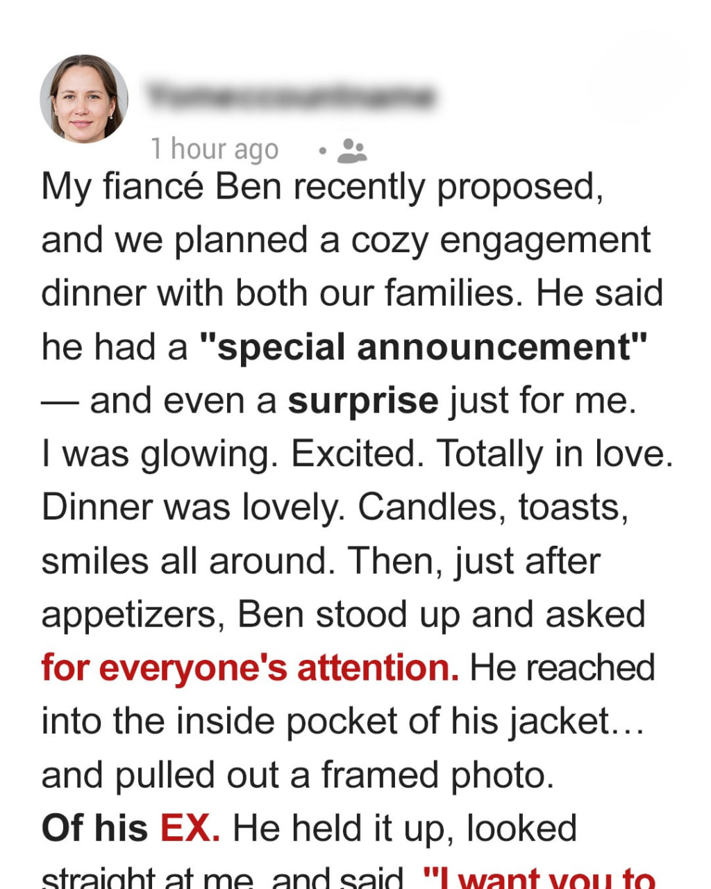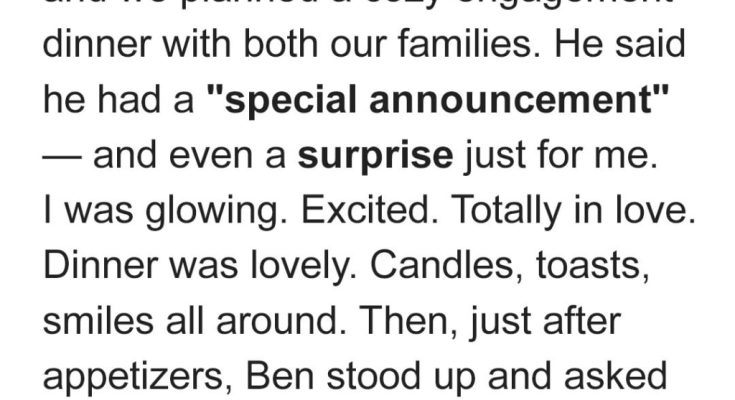 My fiancé said he had a “special surprise” for me at our engagement dinner. We were surrounded by family and well-wishers, but when he raised his glass for a “special toast,” the room froze. What he did made me get up and storm out. I wouldn’t wish that moment on anyone… not even my worst enemy.My name is Olivia, and everyone calls me Livie. Two years ago, I met Ben at a coffee shop in Brookfield, and I fell harder than I’d ever fallen for anyone. His first wife, Natalie, had died in a car accident three years before we met. The grief still lived in his eyes, but I thought love could heal that.