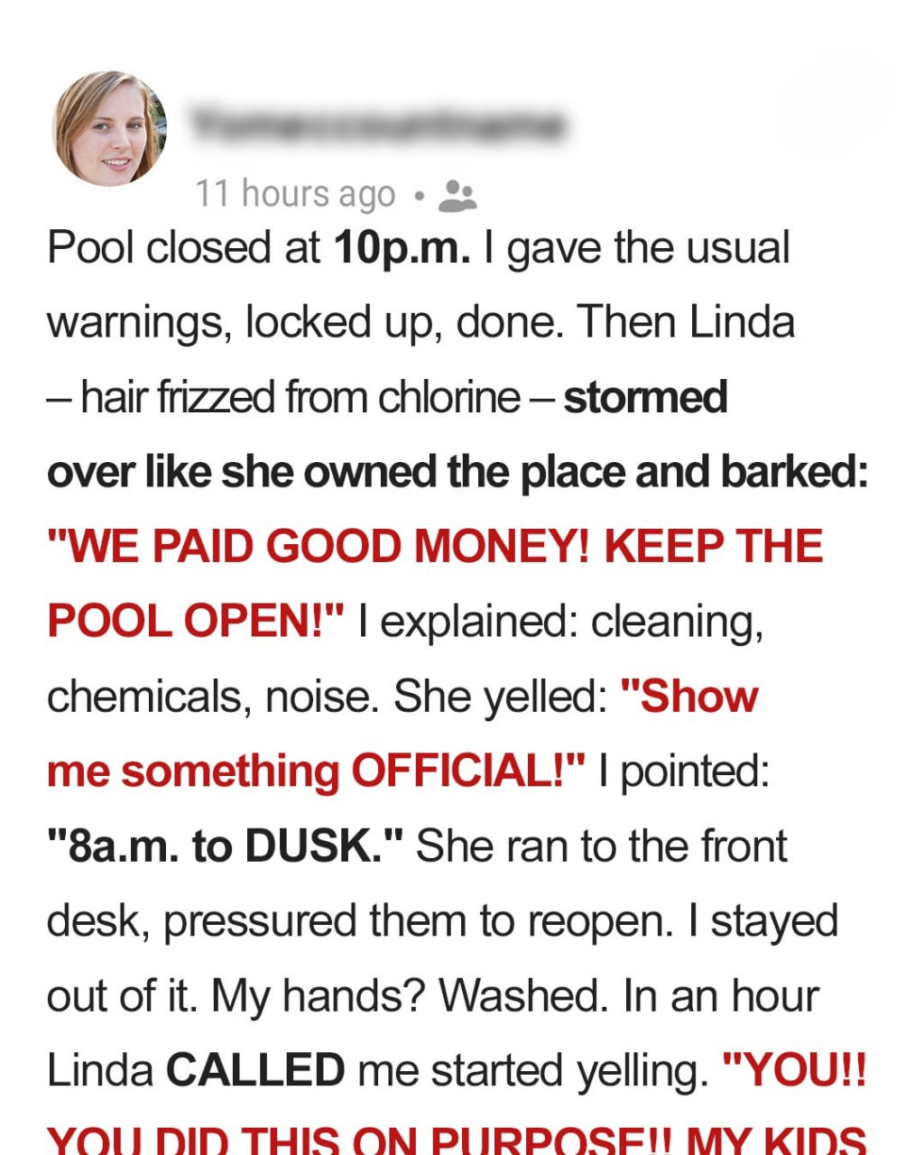 In the end, Linda was charged with trespassing and filing a false police report. Management banned her from the hotel chain. Her kids? Totally fine after a rinse and a glass of water. They experienced no burns, just itchy skin from jumping into a chlorine-heavy pool like it was bath time.