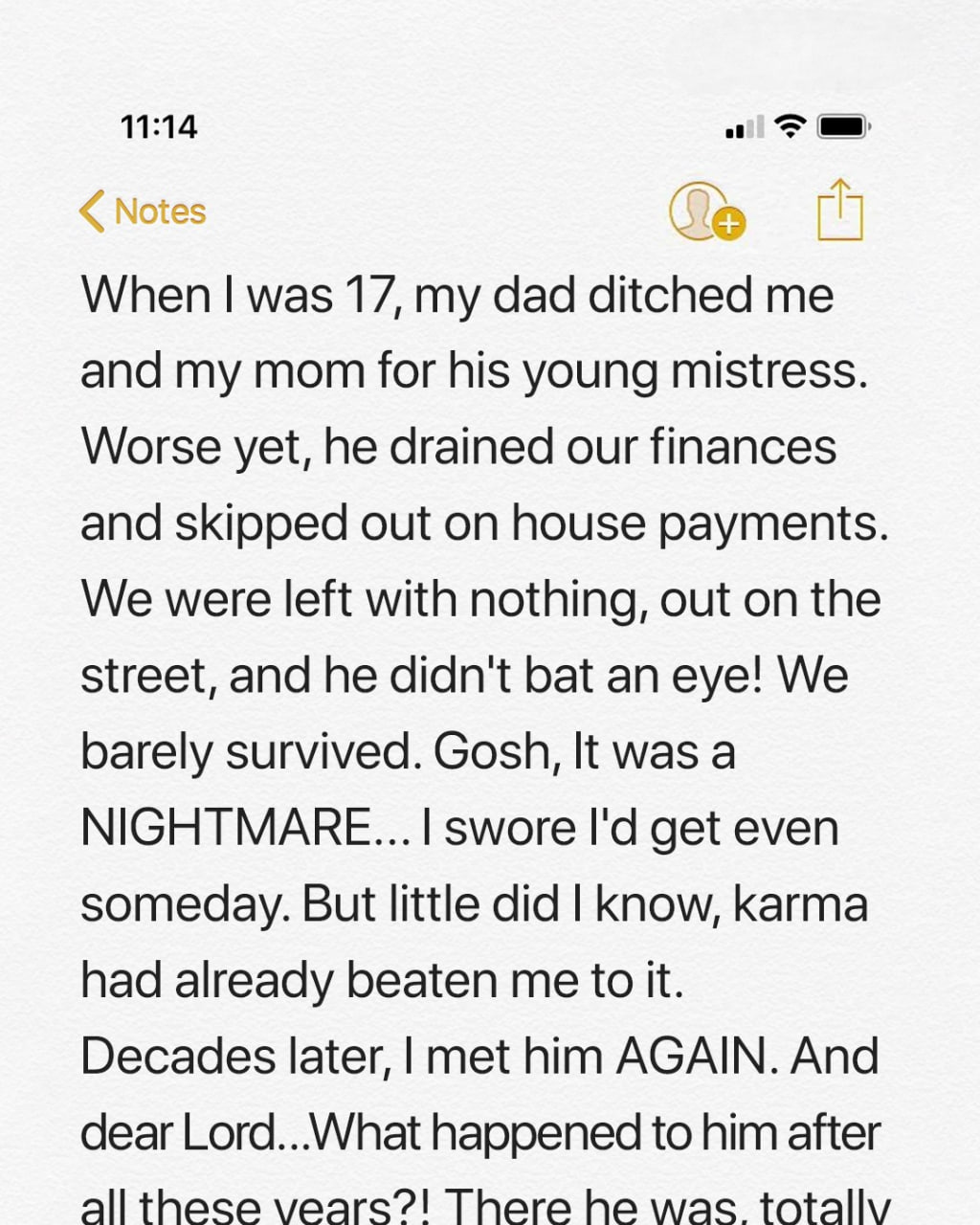 William abandons his wife and daughter to start a new life with his young mistress. But things change years later, and when William least expects things to go wrong, he comes face-to-face with his grown-up daughter.William felt a pang of guilt as his wife anxiously looked at him. For a moment, he reconsidered his decision. He knew Linda would be devastated if she learned he had a mistress.