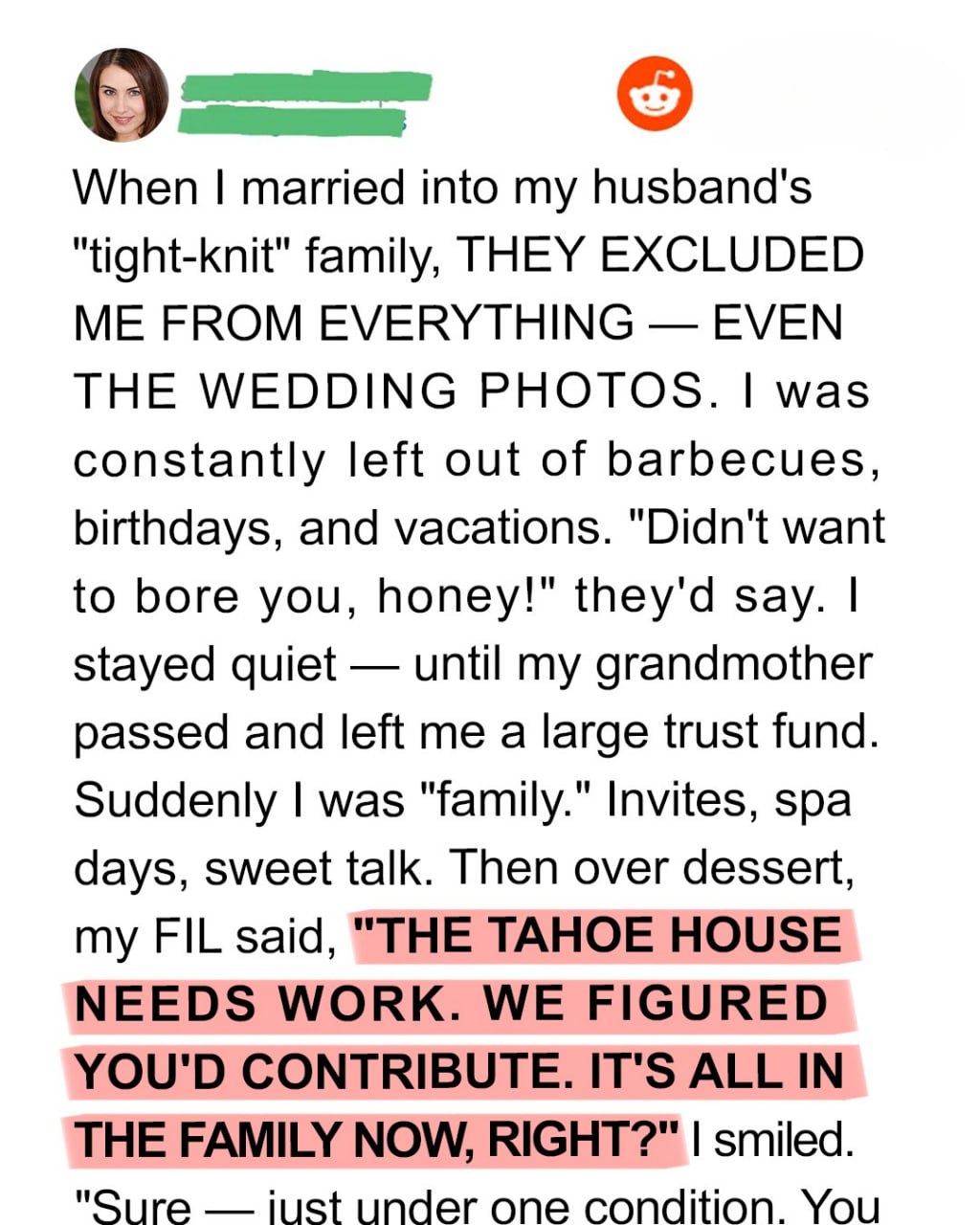 “Tell you what,” I said, voice calm. “Why don’t you first show me all the family photos I’m in from the last five years — you know, before I got the inheritance? Let’s count the parties I was invited to. The family trips I joined. If we get to ten, maybe I’ll think about it.”