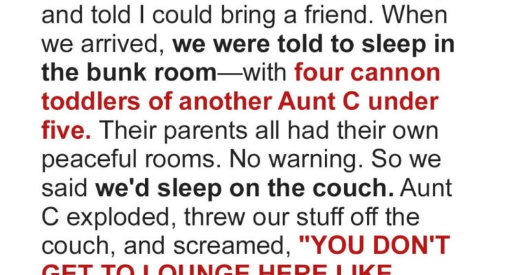“Yes,” Aunt Claire replied, already moving toward the kitchen, as if the conversation was over before it had even begun. “Tom and Laura have their room, Karen and Steve are sharing one, and Liam needs his rest. He’s a growing boy, Riley. Ron’s in the den.”