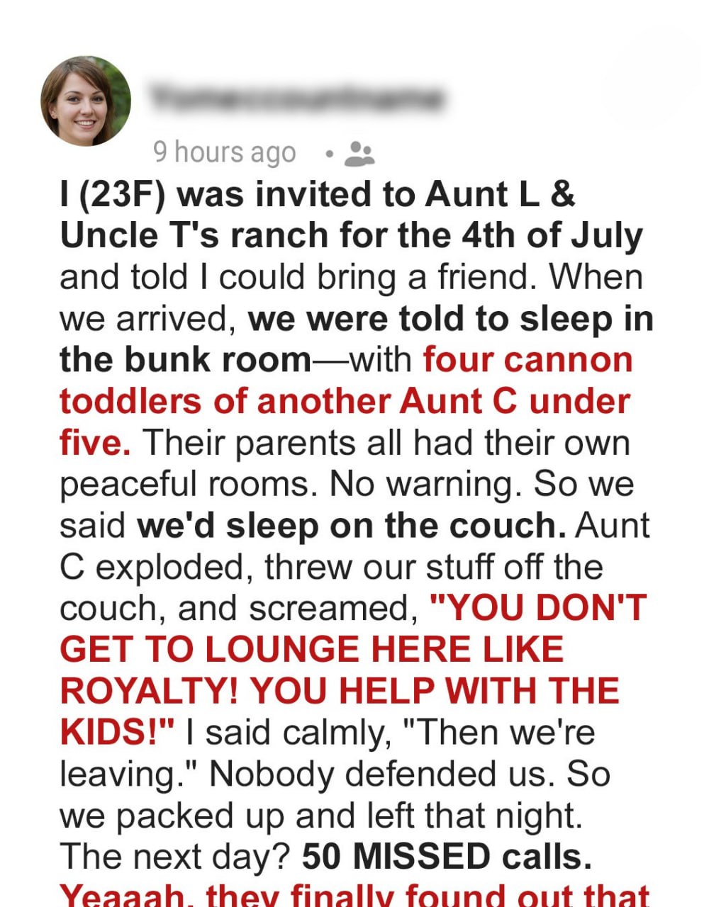 “You don’t get to lounge here like royalty!” she shouted. “You either help with the kids or you leave! Did you think this was a vacation?! This is family!“