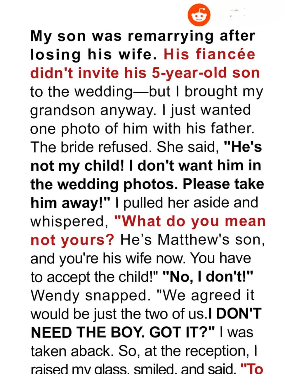 “To Wendy,” I said, “the daughter I never had. May she learn that families aren’t edited like photo albums. They come with history, with love, and with children who miss their mothers and just want a place to belong. And may she one day understand that marrying a man means marrying his whole life, not just the curated parts.”